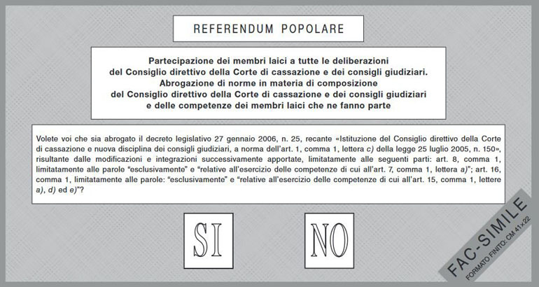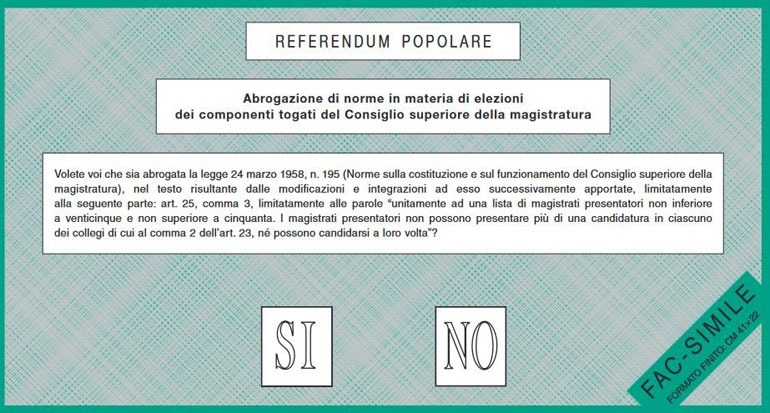 Il quesito sulla Riforma del CSM e l’elezione dei membri togati chiede se si vuole cancellare la norma che impone al magistrato di raccogliere da 25 a 50 firme per candidarsi al Consiglio Superiore della Magistratura.