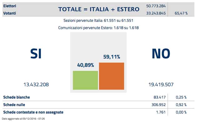 COM’ERA prevedibile nel referendum costituzionale – per il quale gli italiani sono stati chiamati ad esprimersi nella giornata di ieri, 4 Dicembre – ha vinto nettamente il “NO”, con le conseguenti dimissioni del Presidente del Consiglio dei Ministri Matteo Renzi (la conferenza stampa del premier di seguito in video).