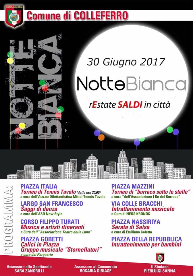 COLLEFERRO (RM) – È tutto pronto per la Notte Bianca di Colleferro che, all’insegna dello slogan “rEstate SALDI in città”, a partire dalle ore 20 di questa sera, animerà diverse aree della città seguendo un interessante programma di iniziative.