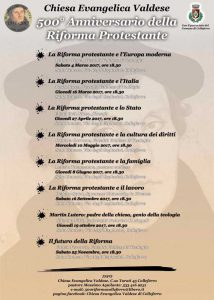Gli ultimi due incontri sono programmati rispettivamente per il 19/10 dove si parlerà di “Martin Lutero: Padre della Chiesa, genio della Teologia”- Relatrice Silvana Nitti- Università Federico II-Napoli e per il 25/11 che affronterà il tema “Il futuro della Riforma”, relatore Fulvio Ferrario -Facoltà Valdese di Teologia.