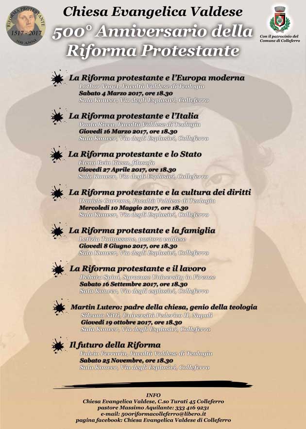 COLLEFERRO (RM) – Riprendono, dopo la pausa estiva, gli incontri promossi dalla Chiesa Valdese di Colleferro, con il Patrocinio del Comune, in occasione dei “500 anni dalle 95 tesi di Martin Lutero”, sull’attualità della Riforma protestante e sull’influenza che essa ha avuto non solo in ambito religioso, ma anche sociale e culturale.