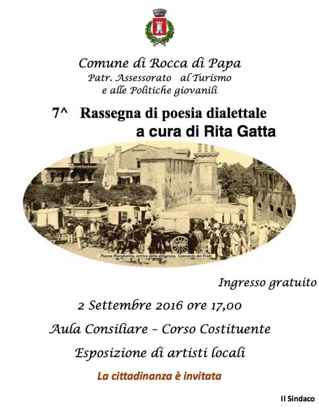 ROCCA DI PAPA (RM) – Venerdì 2 Settembre 2016, nell’Aula consiliare del Comune di Rocca di Papa – Corso Costituente, con il patrocinio dell’Assessorato al Turismo e alle Politiche giovanili, dalle ore 17 alle 19.30, si terrà la “7^ Rassegna di Poesia Dialettale”, curata dalla scrittrice e poetessa Rita Gatta, e, in contemporanea, una “Esposizione di artisti locali”.
