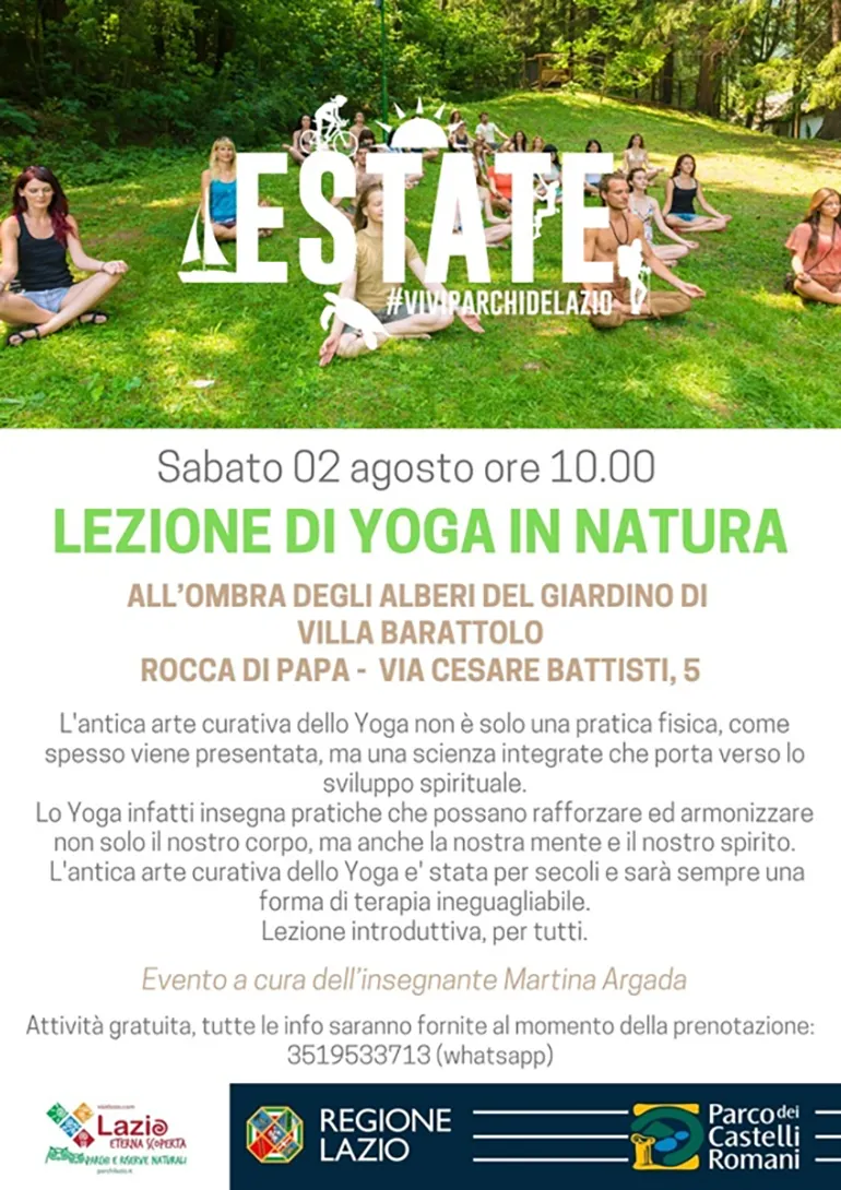 ROCCA DI PAPA (Luciana Vinci) – Sabato 2 Agosto alle ore 10, appuntamento a Rocca di Papa, all’ombra del giardino di ‘Villa Barattolo’ sede del Parco dei Castelli Romani, con la “Lezione di Yoga in Natura”, a cura dell’insegnante Martina Argada.