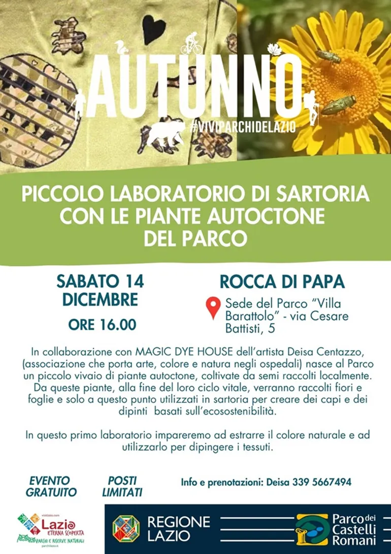 ROCCA DI PAPA (Luciana Vinci) – Sabato 14 Dicembre alle ore 16, si svolgerà presso Villa Barattolo a Rocca di Papa, sede del Parco dei Castelli Romani, l’evento gratuito “Piccolo laboratorio di sartoria con le piante autoctone del Parco”, in collaborazione con Magic Dye House, associazione che porta arte, colore e natura negli ospedali.