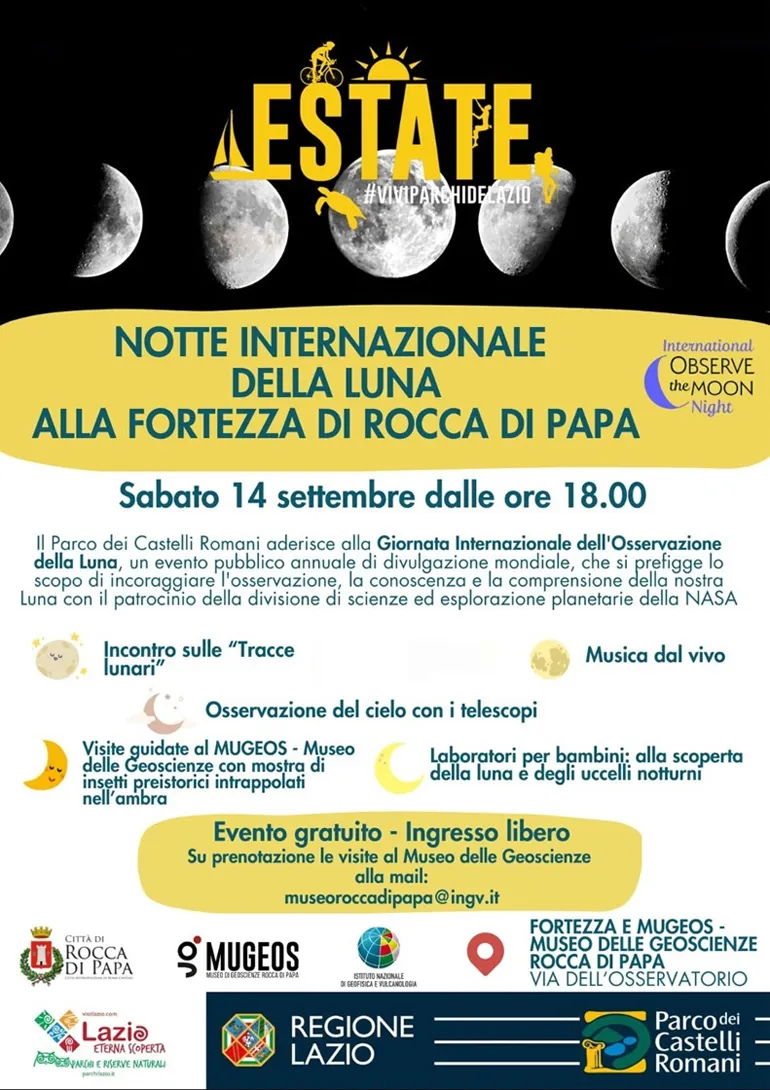 Sabato 14 dalle ore 18.00 vi aspettiamo al Mugeos – Museo delle Geoscienze di Rocca di Papa, per un incontro “lunare” e visite guidate e subito dopo alla Fortezza Medievale con laboratori per i bambini, osservazione del cielo e musica dal vivo. Tutte le informazioni sono disponibili nella locandina.