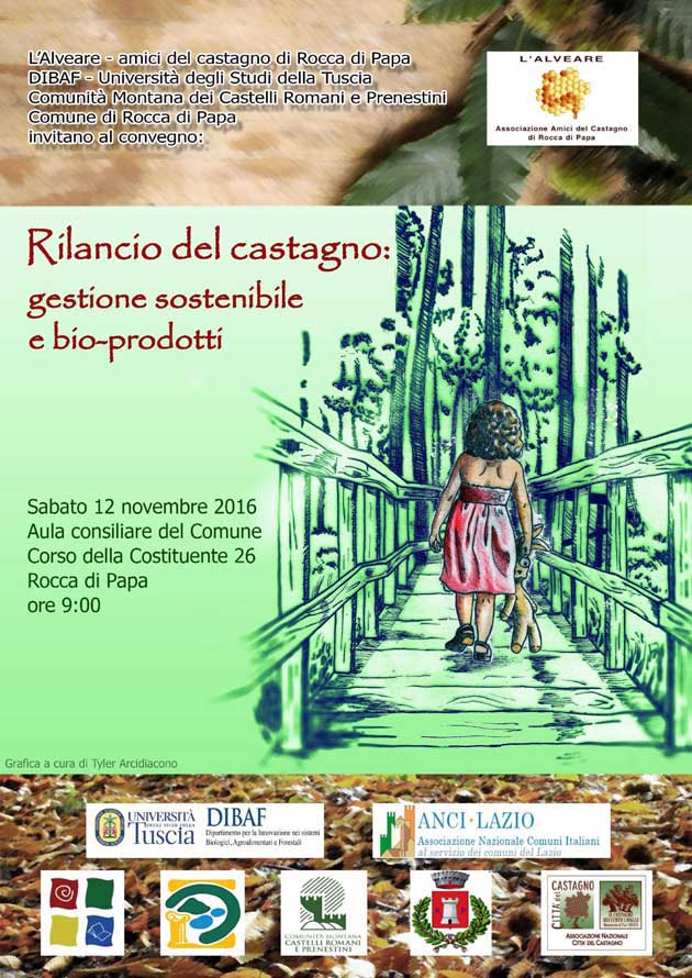 ROCCA DI PAPA (RM) – Sabato 12 Novembre 2016 (ore 9,00-14,00), Rocca di Papa ospiterà, nella sua Aula Consiliare, il 6° Convegno dedicato al “Rilancio del castagno: gestione sostenibile e bio-prodotti”, organizzato da L’Alveare – Associazione Amici del Castagno di Rocca di Papa (attivissimo Presidente Claudio Botti), con il contributo scientifico del Professore Associato, Francesco Carbone, del Dipartimento per la Innovazione dei sistemi Biologici, Agroalimentari e Forestali dell’Università degli Studi della Tuscia, della Comunità Montana Castelli Romani e Prenestini, e del Comune di Rocca di Papa (qui il programma del convegno •>).