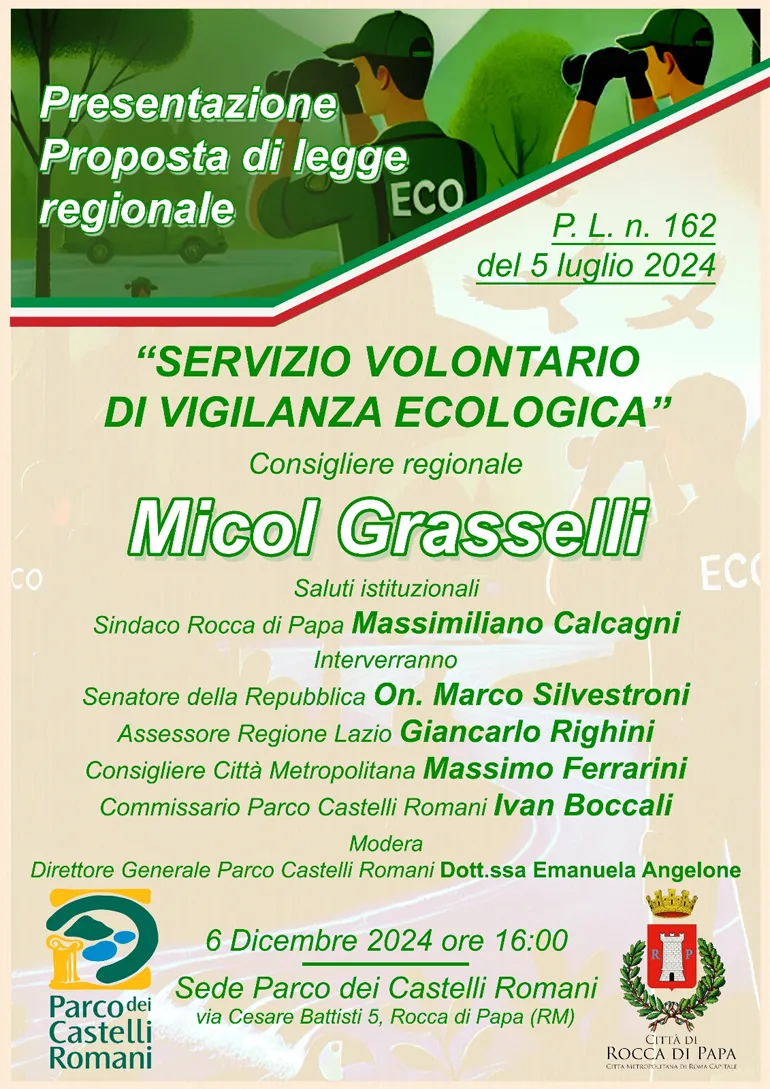 ROCCA DI PAPA (Luciana Vinci) – Venerdì 6 Dicembre 2024, alle ore 16, si svolgerà presso ‘Villa Barattolo’ – Via Cesare Battisti, 5 – sede del Parco regionale dei Castelli Romani a Rocca di Papa, l’incontro di presentazione della proposta di legge regionale “Servizio Volontario di Vigilanza Ecologica”, a cura del Consigliere Regionale Micol Grasselli.