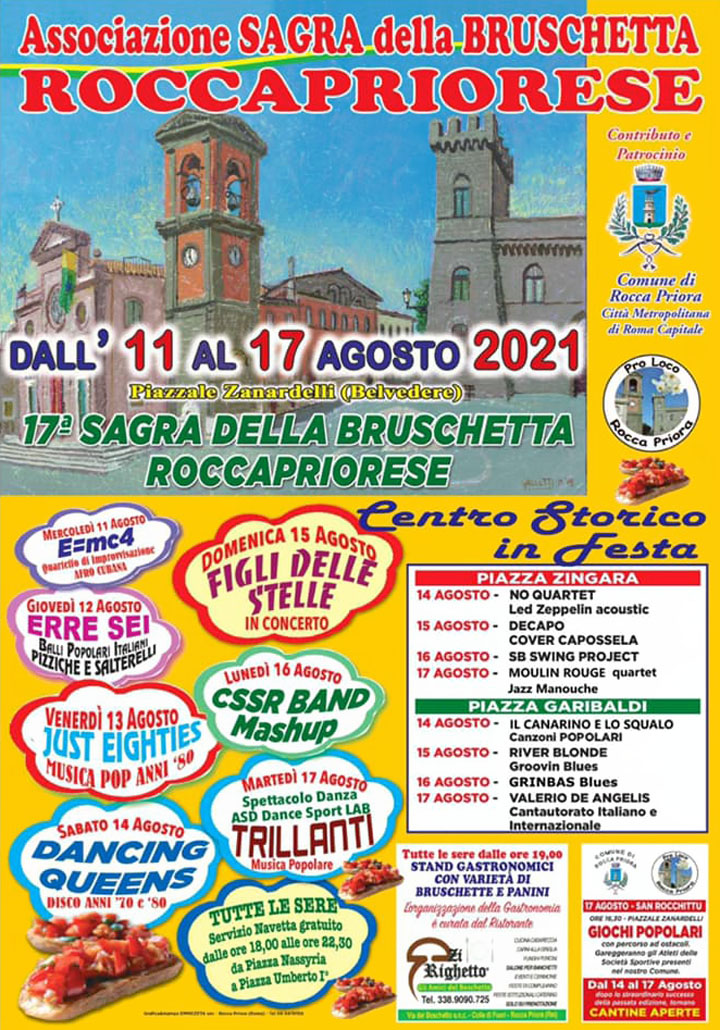 ROCCA PRIORA (Anna Maria Pesce – Luciana Vinci) – Dall’11 al 17 Agosto 2021 si tiene, a Rocca Priora, la 17^ Sagra della bruschetta roccapriorese, organizzata dall’“Associazione Sagra della Bruschetta Roccapriorese”, servita in oltre 30 gusti diversi, e molto apprezzata dai Buongustai del nostro centro e dei paesi vicini: ci saranno anche stand gastronomici di “Zi Righetto”, i fritti dell’eccezionale cuoco Arcangelo Dandini, e per l’occasione, le “Cantine saranno aperte”.