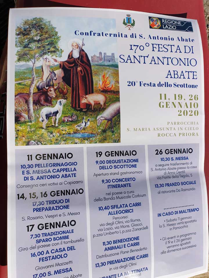 Organizzata dalla Confraternita (presidente Franco Tisbi), è già in corso, a Rocca Priora, la “170^ Festa di Sant’Antonio Abate e la 20^ Festa dello Scottone”, e che, da Sabato 11 Gennaio 2020 si concluderà Domenica 26 Gennaio, con il trasferimento del Santo, tenuto nel 2019 dal Festaiolo Giovanni Mazzetti, nella casa di Anna Gentili, sindaco di Rocca Priora, e con il pranzo della Confraternita nel ristorante “Da Raimondo”.