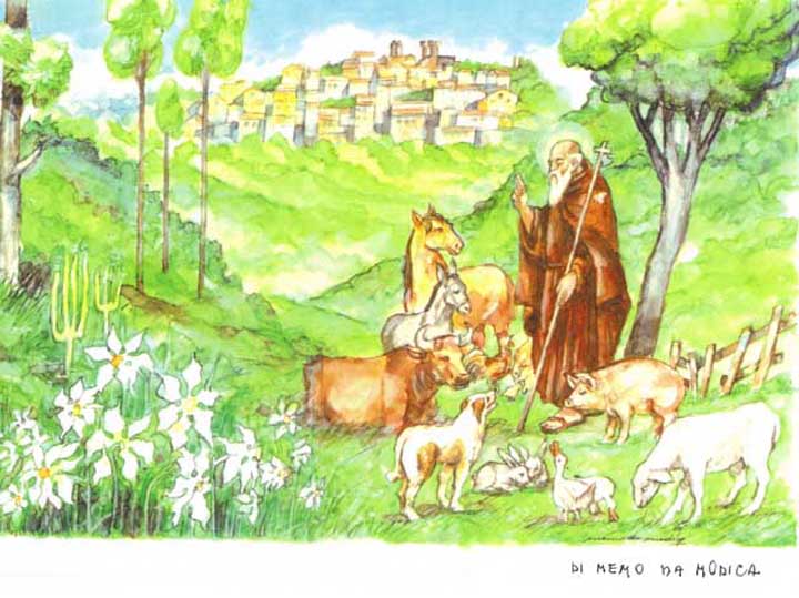 ROCCA PRIORA (A.M. Pesce – Luciana Vinci) – Ci piace aprire i Festeggiamenti di Sant’Antonio Abate di Rocca Priora con il bellissimo acquerello che il grande artista, Memo da Modica, aveva realizzato per la 165^ Festa del Santo, con il panorama di Rocca Priora, i suoi narcisi e la figura dello stesso Santo circondato da molti animali del posto.