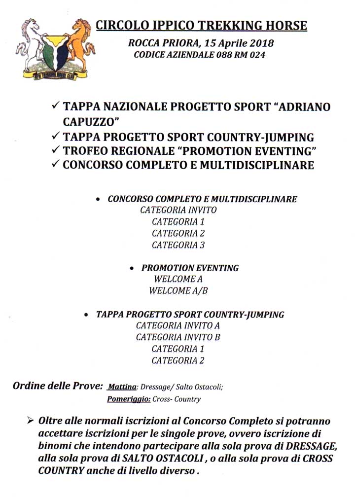 ROCCA PRIORA (A.M. Pesce – Luciana Vinci) – Il 15 Aprile 2018 al Circolo Ippico Trekking Horse di Rocca Priora, Km 29.800 della Provinciale Tuscolana, al mattino e pomeriggio si terranno numerose gare, dedicate al Concorso Completo e Multidisciplinare, al Trofeo Regionale “Promotion Eventing”, alla Tappa Nazionale Progetto Sport “Adriano Capuzzo” e alla Tappa Progetto Sport Country-Jumping.