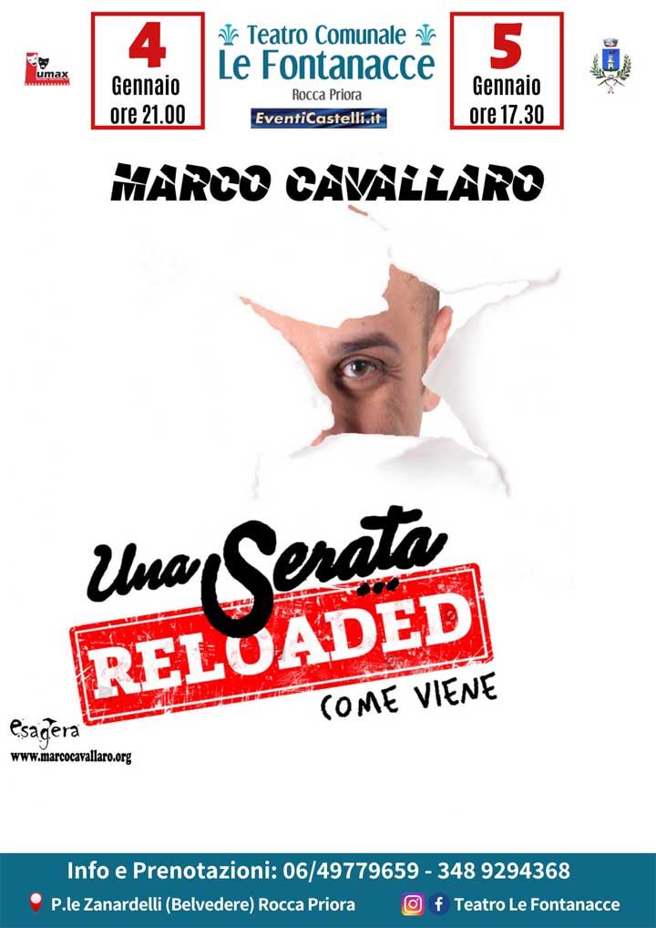 ROCCA PRIORA (Anna Maria Pesce – Luciana Vinci) – Al Teatro Comunale Le Fontanacce di Rocca Priora, inizierà l’attività teatrale del nuovo anno 2020, Sabato 4 Gennaio ore 21 e Domenica 5 Gennaio ore 17.30: salirà sul palco l’attore, autore e regista Marco Cavallaro con il suo ultimo spettacolo “Una serata… come viene – Reloaded”, che già da diverso tempo sta portando in scena nei teatri di tutta Italia, riscuotendo ovunque grande partecipazione di pubblico ed enorme entusiasmo.