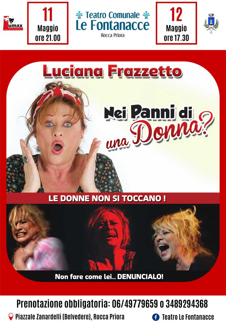 A ROCCA PRIORA (Anna Maria Pesce – Luciana Vinci) , oggi e domani, nel corso della Festa del Narciso 2019, ci sarà la possibilità di partecipare allo spettacolo teatrale, che avrà luogo Sabato 11 Maggio alle ore 21.00 e Domenica 12 alle 17.30, al Teatro Comunale “Le Fontanacce”, dove, a grande richiesta, tornerà sul palco Luciana Frazzetto con l’esilarante monologo comico “Nei panni di una donna”.