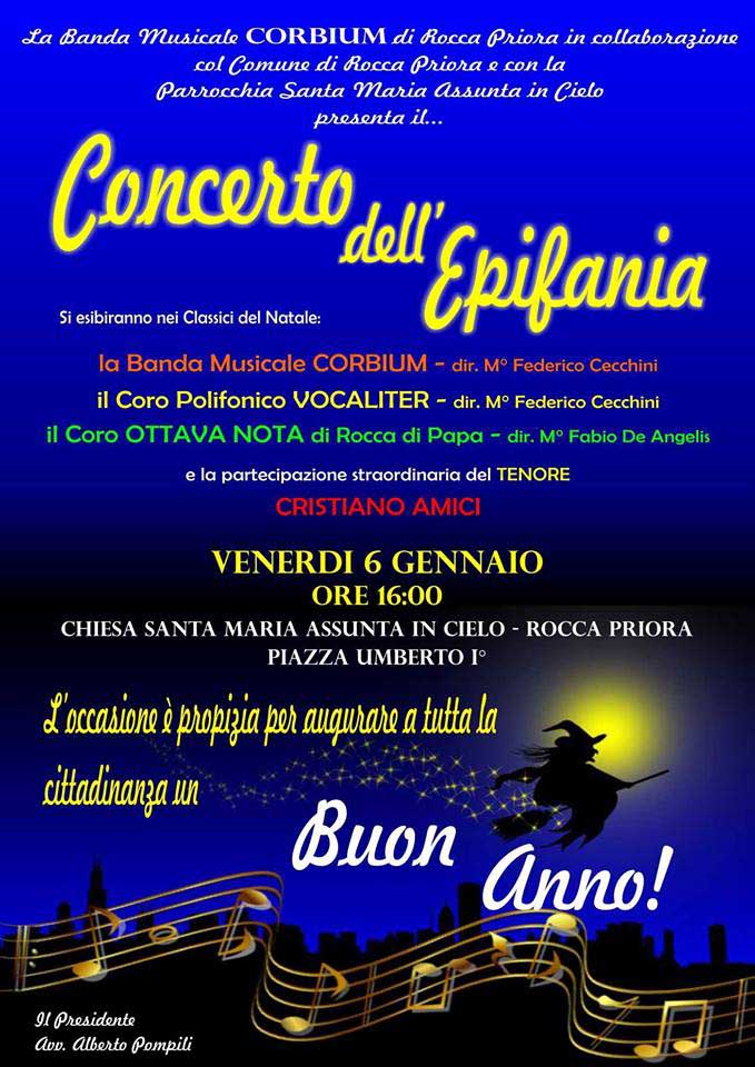 ROCCA PRIORA (RM) – Il 6 Gennaio 2016, nella Chiesa parrocchiale Maria Assunta in Cielo di Rocca Priora, alle ore 16, si terrà il Concerto dell’Epifania, organizzato dalla locale Banda Musicale, in collaborazione con il Comune e la Parrocchia.