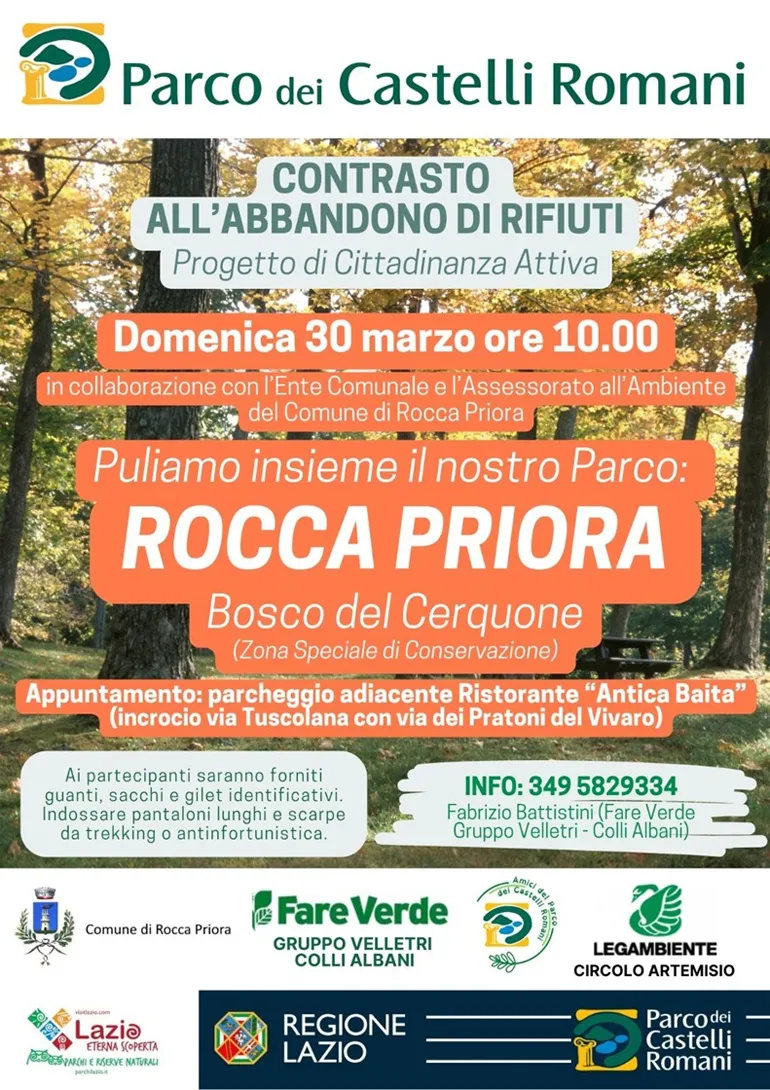 ROCCA PRIORA (Luciana Vinci) – Domenica 30 Marzo, un nuovo appuntamento con il progetto di Cittadinanza Attiva “Contrasto all’abbandono di rifiuti”, promosso dal Parco dei Castelli Romani.