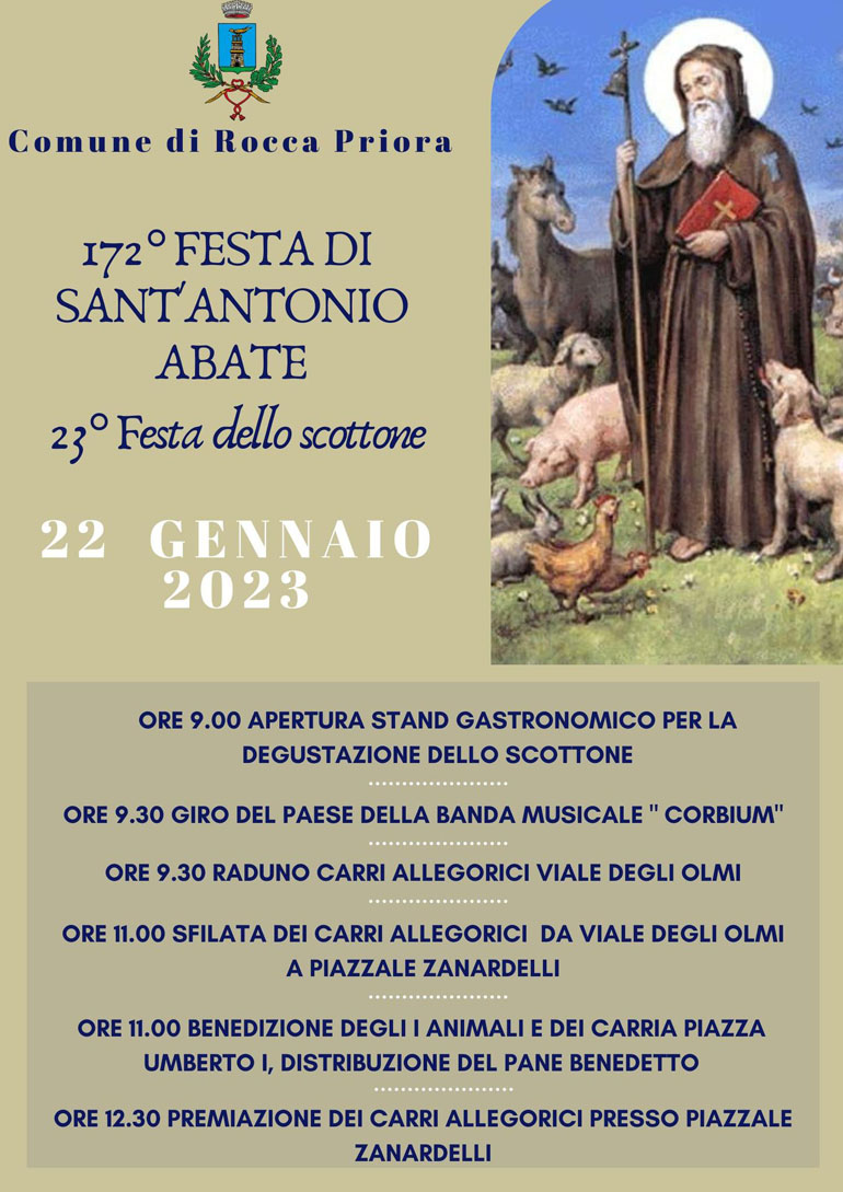 ROCCA PRIORA (L.V.) – Da Martedì 17 Gennaio a Domenica 22: La Benedizione degli animali in piazza, il paese in festa al ritmo della Banda che attraversa strade e i vicoli, la distribuzione del Pane benedetto, i carri, il formaggio Scottone caldo servito in ciotola e lo spirito di accoglienza che caratterizza da sempre il paese più alto dei Castelli Romani: è questa la Festa di Sant’Antonio Abate nell’edizione speciale del 2023 quest’anno a Rocca Priora, sotto la regia della Parrocchia di Santa Maria assunta in Cielo e dell’antica Confraternita di Sant’Antonio Abate.