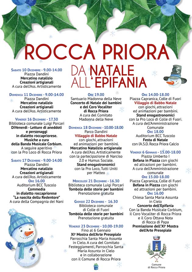 Venerdì 23 Dicembre, invece, verrà inaugurata l’XI Mostra dell’Arte Presepiale nella Parrocchia Santa Maria Assunta in Cielo. Le premiazioni di quest’ultimo evento avverranno nel giorno dell’Epifania, Venerdì 6 Gennaio. Nello stesso giorno, nel primo pomeriggio, appuntamento in centro storico e a Colle di Fuori con “La Befana in Piazza”: previsti giochi ed animazione per i più piccoli in Piazza Umberto I e in Piazza Capranica. Alle ore 16.00 grande “Concerto dell’Epifania” con la Banda Musicale Corbium, il Coro Vocaliter di Rocca Priora e il Coro Ottava Nota di Rocca di Papa.