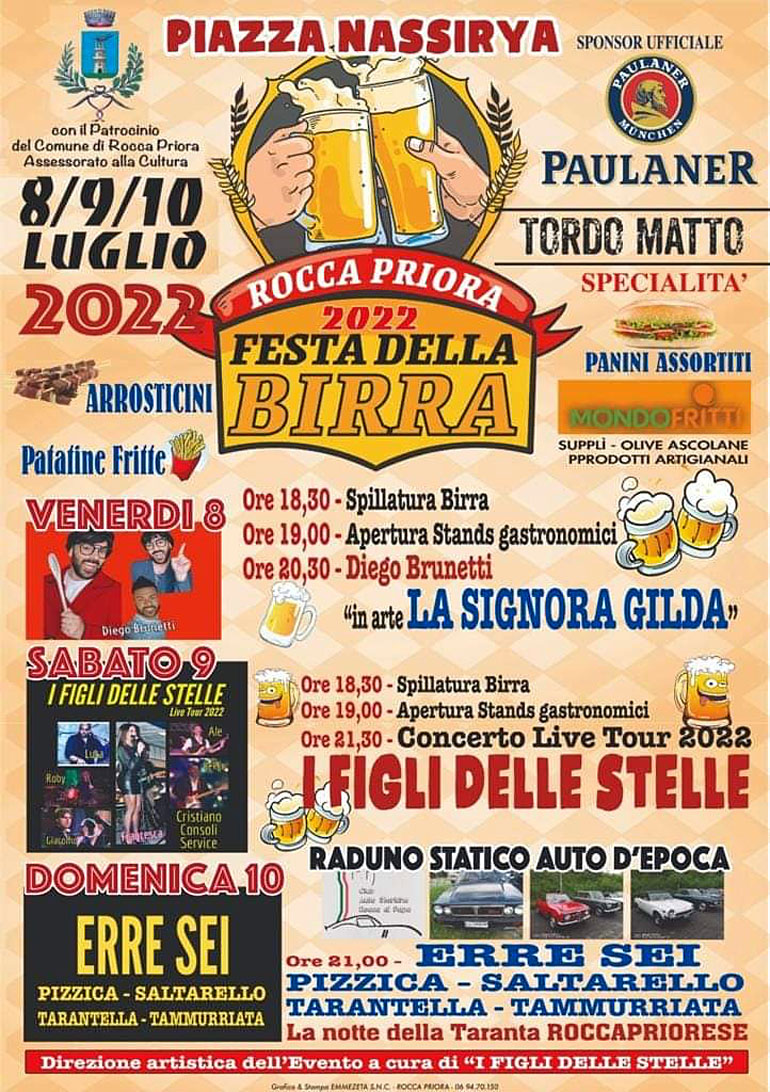 ROCCA PRIORA (Anna Maria Pesce – Luciana Vinci) – La ”Festa della Birra” è molto apprezzata non solo dai roccaprioresi ma anche da moltissimi turisti che vengono ogni anno dai Castelli Romani e dalla capitale Roma (solo 28 Km ) per la “Spillatura della Birra: ore 18,30”, per la gustosa gastronomia con le specialità del “Tordo Matto” e di tutti i prodotti del mondo fritto che troviamo negli stand gastronomici: apertura dalle 19.00, e per i personaggi dello spettacolo che allietano la Festa, che si concluderà Domenica 10 Luglio 2022 con “La notte della Taranta ROCCAPRIORESE.