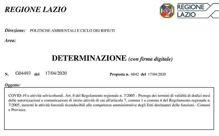 Per questo motivo pubblichiamo la “Determinazione di proroga della stagione di taglio, emessa dalla Regione Lazio”, perché tutti gli interessati, nella stessa Regione Lazio, possano conoscerla ed agire di conseguenza.