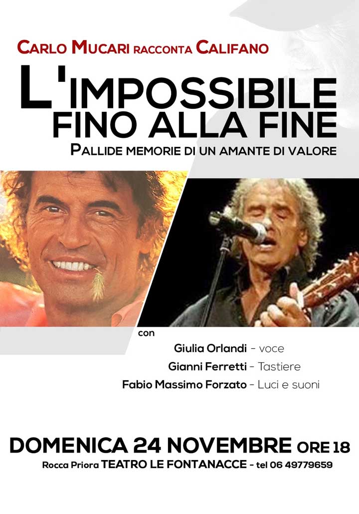ROCCA PRIORA (Anna Maria Pesce – Luciana Vinci) – Domenica 24 Novembre 2019, alle ore 18.00, al Teatro Le Fontanacce di Rocca Priora, tornerà di nuovo in scena il brillante artista e cantante, Carlo Mucari, che sappiamo sia molto legato al nostro centro, e che racconterà, in modo particolare ed affettuoso: “Califano – L’impossibile fino alla fine con pallide memorie di un amante di valore”.
