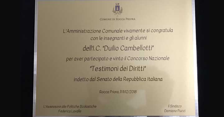 ROCCA PRIORA (A.M. Pesce – Luciana Vinci) – È stata veramente una bella soddisfazione, non solo per la Scuola e per i ragazzi, ma anche per la Preside Laura Micocci, per la professoressa Caterina Paone, Genitori ed Amministrazione comunale, aver avuto il 1° Premio ex aequo al Senato della Repubblica Italiana per il Concorso “Testimoni dei diritti” , tanto che il Sindaco, Prof. Damiano Pucci, presente al Senato, ha invitato i premiati nell’Aula consiliare per la consegna di una Targa di riconoscimento per il lavoro svolto dagli alunni e dalla Professoressa Paone, che da molti anni è nell’Istituto Scolastico I.C. Duilio Cambellotti di Rocca Priora.