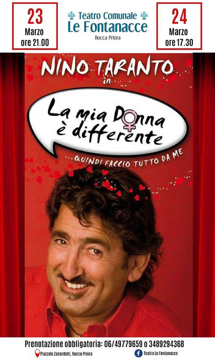 ROCCA PRIORA (A.M. Pesce – Luciana Vinci) – Continuano i successi al Teatro Comunale Le Fontanacce di Rocca Priora e Nino Taranto, reduce dalla trasmissione televisiva “ECCEZIUNALE VERAMENTE….”, vi terrà Sabato 23 alle ore 21.00 e Domenica 24 Marzo alle 17.30, lo spettacolo: «La mia donna è differente».