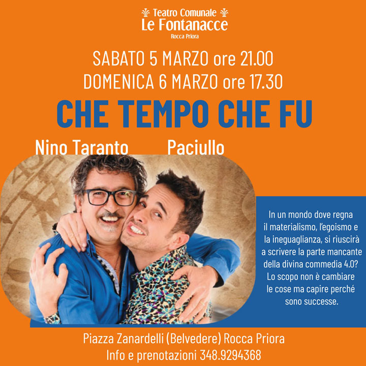 ROCCA PRIORA (Anna Maria Pesce – Luciana Vinci) – Sabato 5 Marzo alle ore 21 e Domenica 6 Marzo alle ore 17.30, ritornano sul palco del Teatro “Le Fontanacce” i bravissimi Nino Taranto e Paciullo con lo spettacolo “Che Tempo Che Fu”.