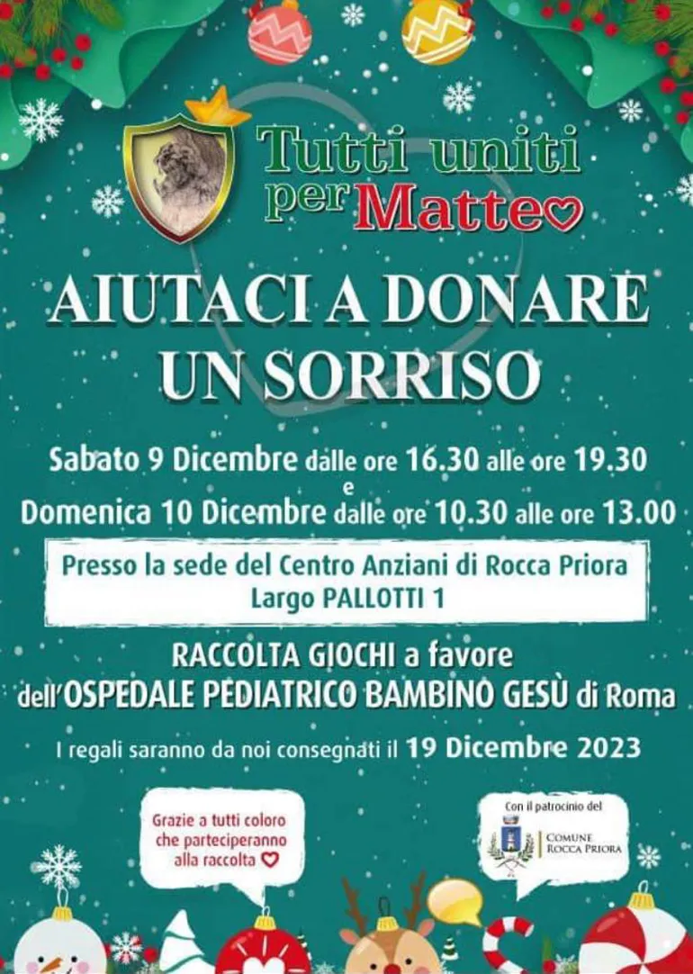 È questa la prima iniziativa benefica del programma organizzato dall’Associazione “Tutti uniti per Matteo (sempre ricordato a Rocca Priora)” ed è dedicata ai bambini.
