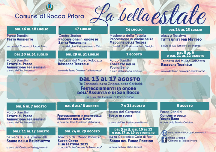 ROCCA PRIORA (Anna Maria Pesce – Luciana Vinci) – Prima di leggere il bellissimo Programma Comunale per gli eventi estivi di Rocca Priora, dedicato ai piccoli e grandi di tutte le età, e che avrà luogo dal 16 Luglio al 19 Settembre 2021: