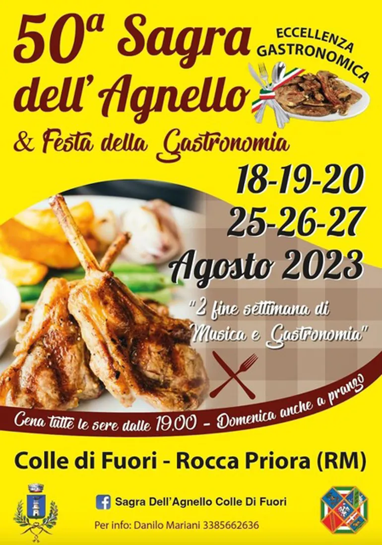 È lo stesso week end (dal 18 al 20) in cui a Colle di Fuori si svolgerà la prima “sessione” della Sagra dell’Agnello con annessa Festa della Gastronomia. Sarà una edizione speciale, la 50°, frutto di una lunga tradizione. Cena tutte le sere, la domenica anche a pranzo. Con replica nel fine settimana successivo: 25-26-27 Agosto.