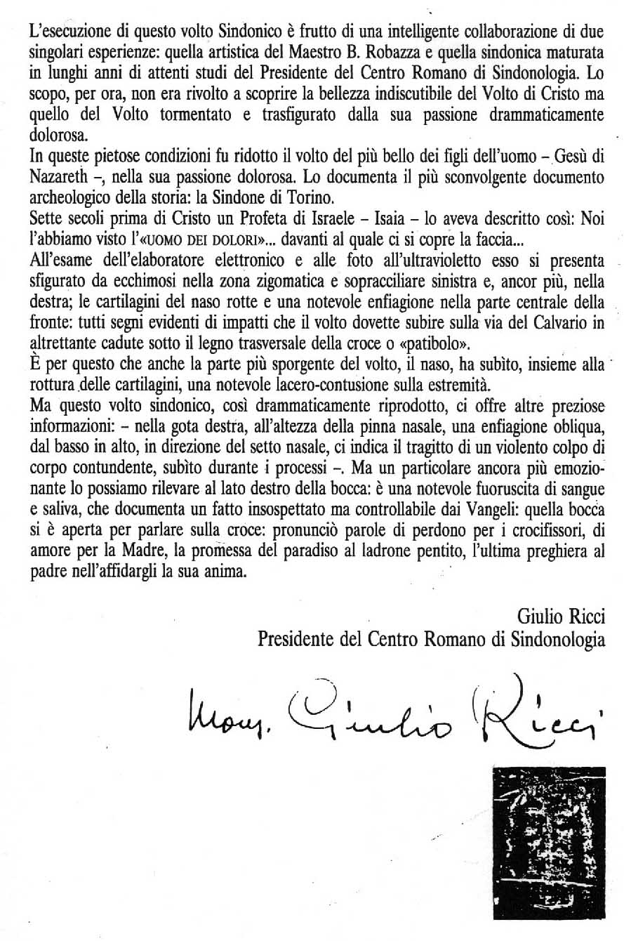Infatti, l’opera, oltre la firma di Robazza è anche controfirmata dallo stesso Mons. Ricci, Presidente del Centro Romano di Sindonologia, autore anche di una interessantissima relazione su quanto rilevato, nel corso dello studio triennale, sul volto della Sacra Sindone, che riportiamo per intero, come immagine, tratta dal volume “Robazza”, e, che è particolarmente importante leggere.