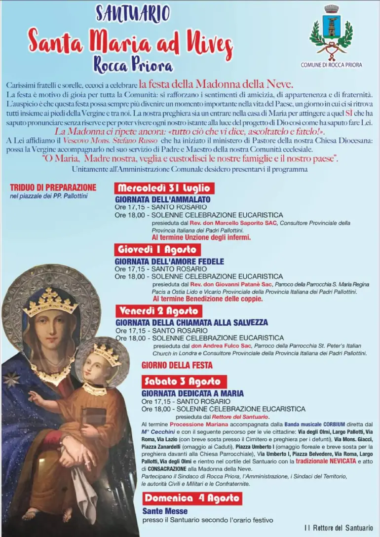 ROCCA PRIORA (Luciana Vinci) – Da oggi, 31 Luglio, e fino al 4 Agosto, mentre proseguono le altre iniziative estive previste nel ridente centro castellano, si svolgeranno le celebrazioni in onore della Madonna della Neve.