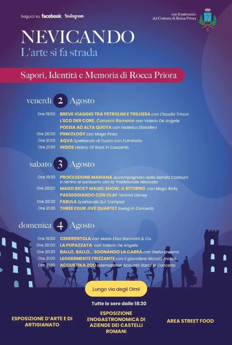In particolare dal 2 al 4 Agosto è previsto l’evento Nevicando, l’arte si fa strada. Cultura, Musica, Intrattenimento per tutte l’età lungo Via degli Olmi.