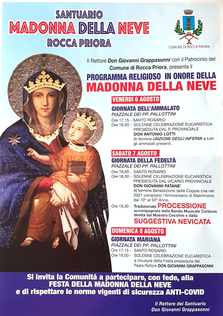 Il Comune e il Comitato Madonna della Neve, il quale come ogni anno cura l’organizzazione dei festeggiamenti insieme al Rettore Don Giovanni Grappasonni, invitano tutta la cittadinanza a rispettare durante i riti religiosi le misure anti-covid in vigore.