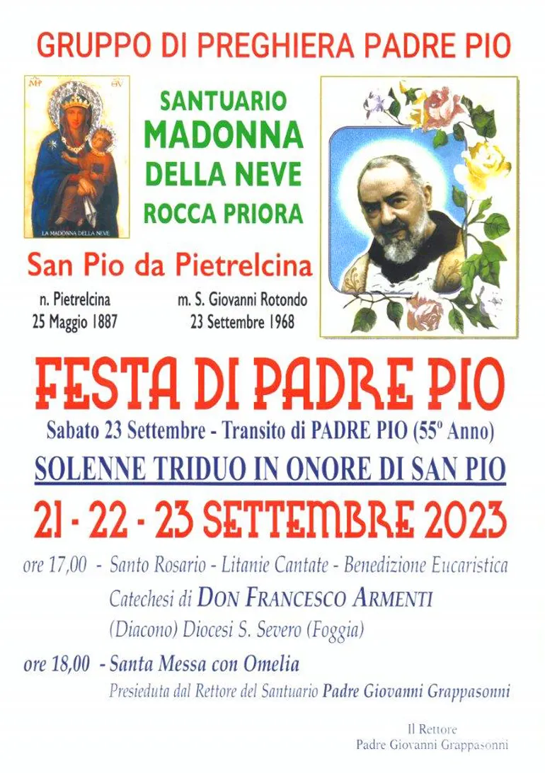 ROCCA PRIORA (Luciana Vinci) – Nel Santuario Madonna della Neve il Gruppo di Preghiera Padre Pio terrà nei giorni 21- 22 e 23 Settembre 2023 la Festa a San Pio da Pietrelcina.
