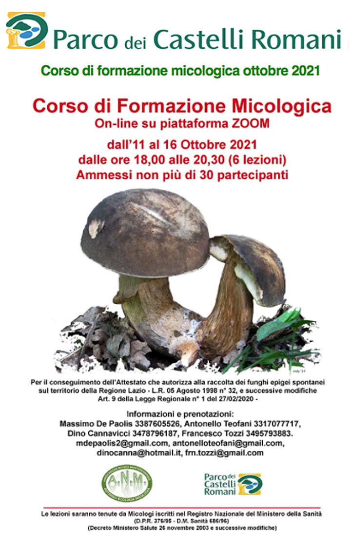 Il Parco Castelli Romani ha indetto per il 2021 la seconda edizione autunnale On-line del Corso di Formazione Micologica, inserito nella programmazione di “Cose Mai Viste”, e curato dall’Associazione “Natura Mediterranensis”.