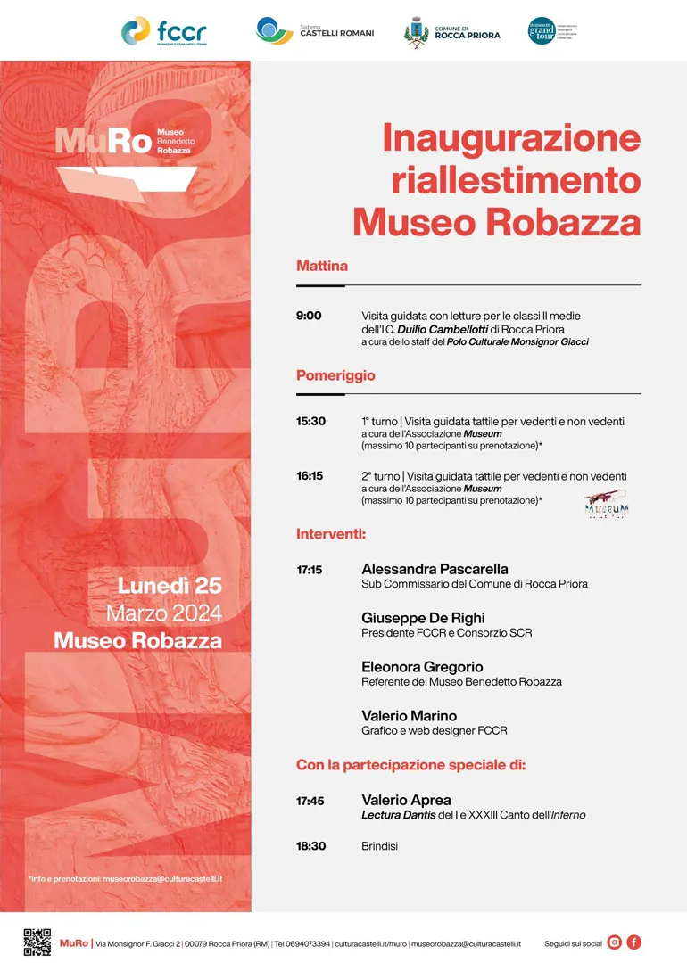 Per info e prenotazioni: MuRo | Museo Benedetto Robazza Via Monsignor F. Giacci 3 00079, Rocca Priora (RM) tel. 06/94073394 – email: museorobazza@culturacastelli.it sito internet: https://www.facebook.com/museobenedettorobazza