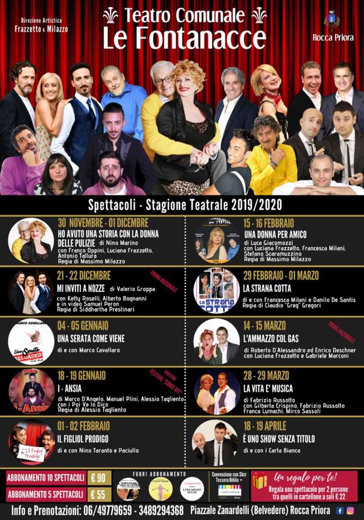 ROCCA PRIORA (Anna Maria Pesce – Luciana Vinci) – Riprende l’attività al Teatro Comunale “Le Fontanacce”: il 23 Novembre presentazione del cartellone teatrale 2019/2020 con “Assaggi di Stagione”.