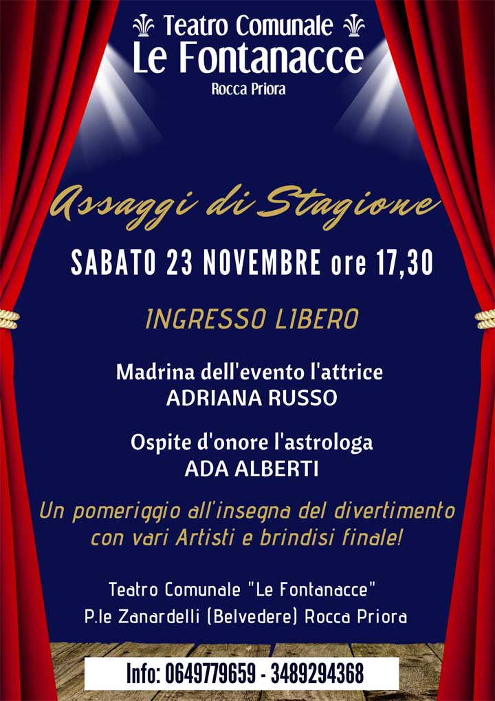 ROCCA PRIORA (Anna Maria Pesce – Luciana Vinci) – Riprende l’attività al Teatro Comunale “Le Fontanacce”: il 23 Novembre presentazione del cartellone teatrale 2019/2020 con “Assaggi di Stagione”.