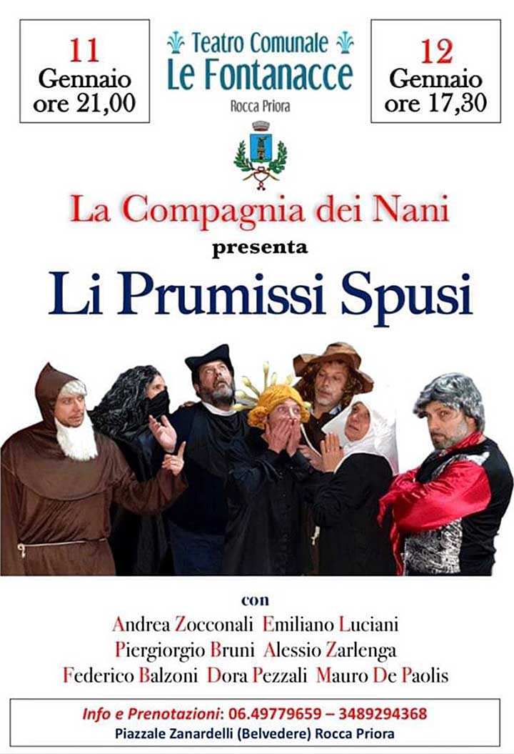 Al Teatro le Fontanacce porteranno in scena “Li Prumissi Spusi” una rilettura dell’originale manzoniano riscritto dalla Compagnia dei Nani in chiave comica e recitata in dialetto roccapriorese con: Andrea Zocconali, Emiliano Luciani, Piergiorgio Bruni, Alessio Zarlenga, Federico Balzoni, Dora Pezzali, Mauro De Paolis.