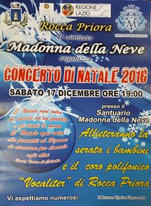 ROCCA PRIORA (RM) – Il “Concerto di Natale 2016” – che avrà luogo il 17 Dicembre, alle ore 19, nel Santuario Madonna della Neve di Rocca Priora, con la partecipazione dei bambini e del locale Coro Polifonico “Vocaliter”, organizzato dal Comitato Festeggiamenti, e che ogni anno richiama tantissimi appassionati dei canti natalizi – presenterà, quest’anno, per la prima volta in assoluto, “L’Inno alla Madonna della Neve”, testo di don Luigi Di Giulio e musica di don Giancarlo Centioni, ambedue Sacerdoti Pallottini.