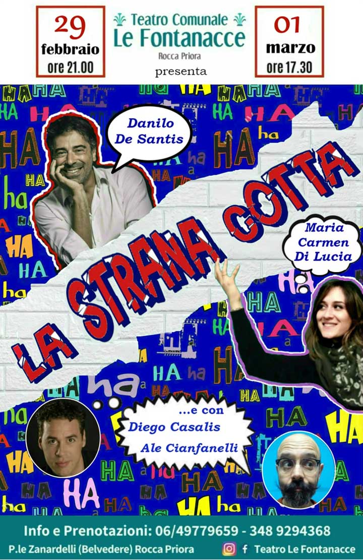 ROCCA PRIORA (Anna Maria Pesce – Luciana Vinci) – Al Teatro Comunale Le Fontanacce di Rocca Priora, Sabato 29 Febbraio 2020, alle ore 21.00, e Domenica 1 Marzo, alle ore 17.30, saranno in scena, con lo spettacolo “La strana Cotta”, Danilo De Santis e Maria Carmen Di Lucia.