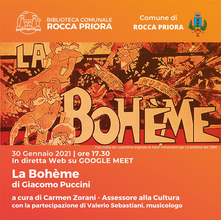 A ROCCA PRIORA (Anna Maria Pesce – Luciana Vinci) : online: Sabato 30 Gennaio, alle ore 17.30, su Google Meet, si terrà il III Atto della Bohème, già molto seguita in precedenza dagli amanti dell’Opera, e particolarmente curata dalla Vicesindaco ed Assessore alla Cultura, Carmen Zorani.