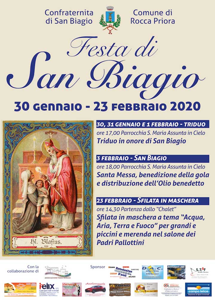A ROCCA PRIORA (Anna Maria Pesce – Luciana Vinci) torna la tradizionale Festa di San Biagio che inizierà con i tre pomeriggi del 30, 31 Gennaio e 1 Febbraio 2020 dedicati al Triduo in onore del Santo, proseguirà il 3 Febbraio con la Santa Messa, la Benedizione della gola e la distribuzione dell’Olio benedetto e terminerà il 23 Febbraio con la grande Sfilata in maschera per le strade della città.