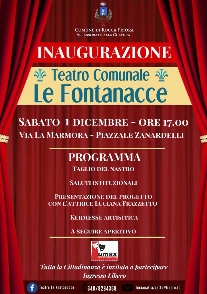 Sabato 1 Dicembre alle ore 17.00, l’Amministrazione Comunale di Rocca Priora e l’Attrice Luciana Frazzetto, inaugurano il Teatro Comunale de “Le Fontanacce”. Nel corso della cerimonia, la Sala sarà intitolata a Luigi Mastracci già Sindaco di Rocca Priora dal 1964 al 1970.
