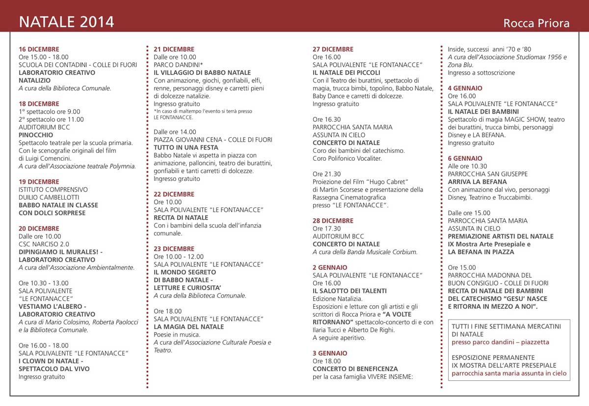 ROCCA PRIORA (RM) – Veramente ricco il programma dei festeggiamenti, allestito dal Comune di Rocca Priora per rendere più festoso il Natale dei cittadini del posto e della frazione Colle di Fuori, che, a partire dal 16 Dicembre 2014 e fino al 6 Gennaio 2015, verranno coinvolti in numerose attività creative, ricreative, artistiche e culturali.
