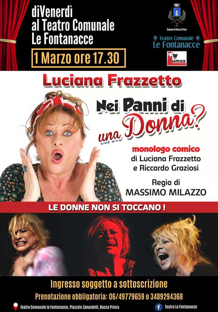 Rocca Priora. Venerdì 1 Marzo (ore 17.30) al Teatro Comunale “Le Fontanacce” salirà sul palcoscenico Luciana Frazzetto con l’esilarante monologo comico “Nei panni di una donna”