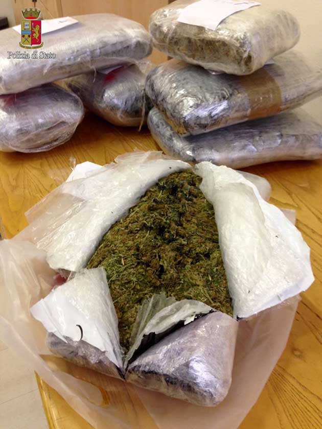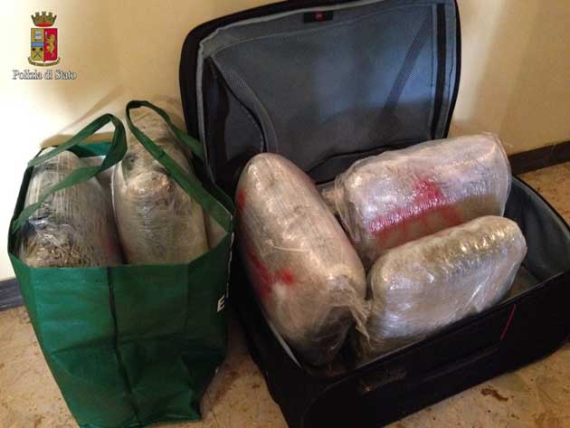 In casa, all’interno di una valigia e nell’armadio della camera da letto, sono state rinvenute 7 confezioni di marijuana per un peso complessivo di circa 14 kg, nonché due “cartuccere” contenenti piccoli involucri di hashish per un peso di circa 1 kg.