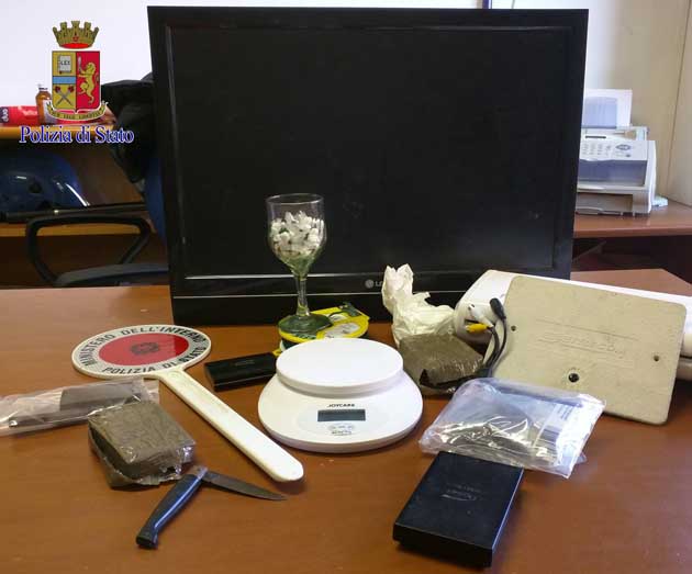 Nel covo – dove al momento dell’intervento non c’era nessuno – è stato trovato tutto il necessario per il taglio ed confezionamento delle dosi di cocaina, 39 delle quali erano curiosamente custodite in alcuni calici da vino.