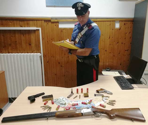 I Carabinieri hanno trovato, sull’unico tavolo presente nel locale, una pistola Sig Sauer con matricola abrasa completa di caricatore con 7 cartucce, una pistola Browning, detenuta illegalmente, completa di caricatore con 11 cartucce e alcune scatole con altre 50 cartucce.